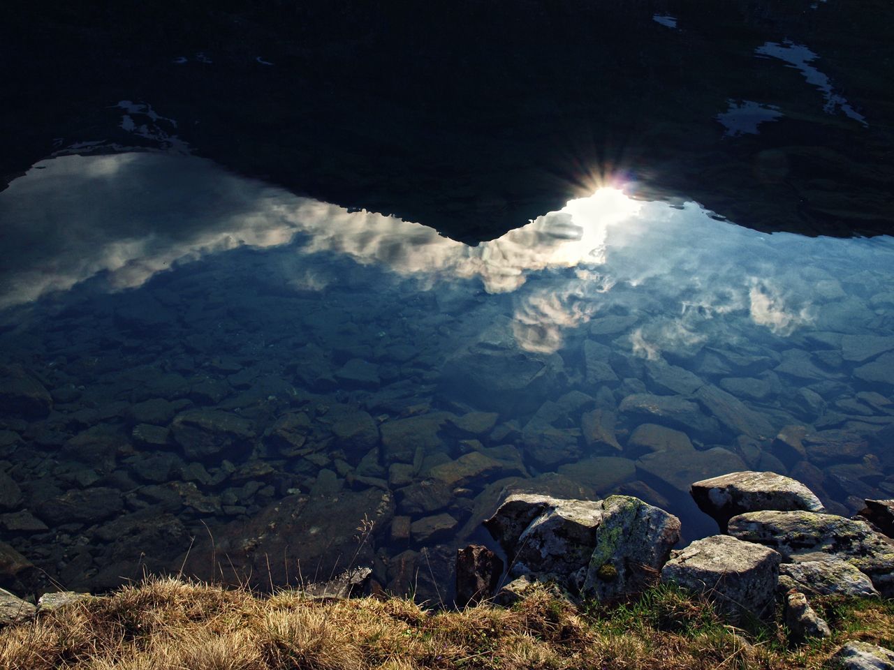 Výstup na Waldhorn rušíme,čekalo by nás ještě 400 výškových metrů po rozervaném hřebeni ve vichru a to se nám moc nechtělo,přeci jen už bylo pozdě a hrozil déšť.Takže jsme sestupovali a hledali místo na nocleh,chtěl jsem dojít až dolů k Zwerfenberg see,Jirka ale byl utahanej a chtěl postavit kemp někde ve stráni s čímž jsem zásadně nesouhlasil,zaprvé tam nikde nebyl rovnej plácek pro dva stany a zadruhé by nám nestačila voda a za třetí ve stráni fučelo,takže jsem byl asi trochu nepříjemnej,ale nakonec jsme došli k plesu,kde jsem našel mezi balvany luxusní plácek pro dva stany hned u vody,vodu jsme brali z potoka přitékajícího z horního plesa.Nakonec i Jirka uznal,že můj nápad byl lepší.
