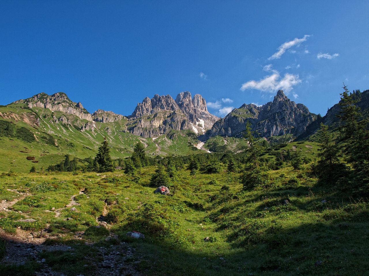 Začátkem prázdnin jsem vyrazil na čtyři dny do Alp.Parťáka mi dělal Jirka1 z outdoorfora,se kterým jsem se domluvil na společném výletu i když jsme se předtím neznali.Původně jsem si myslel že to bude čtyřdenní trek se spaním ve stanu,ale nakonec to bylo všechno trochu jinak.Z Prahy vyrážím něco před druhou ráno .Cesta ubíhá celkem svižně,k ránu ještě není provoz ani u Linze,kde dáváme coffee break,s Jirkou se seznamujeme(známe se jen z netu)a něco před devátou jsme ve Schladmingu.Počasí slibuje nádherný den a tak vyrážíme z parkoviště u vodopádů Riesachu směrem k Preintaller hutte která leží 1656m.n.m. Já jdu přes vodopády,Jirka tady už byl,chce šetřit síly a tak jde po cestě,sraz máme nahoře u jezera.
